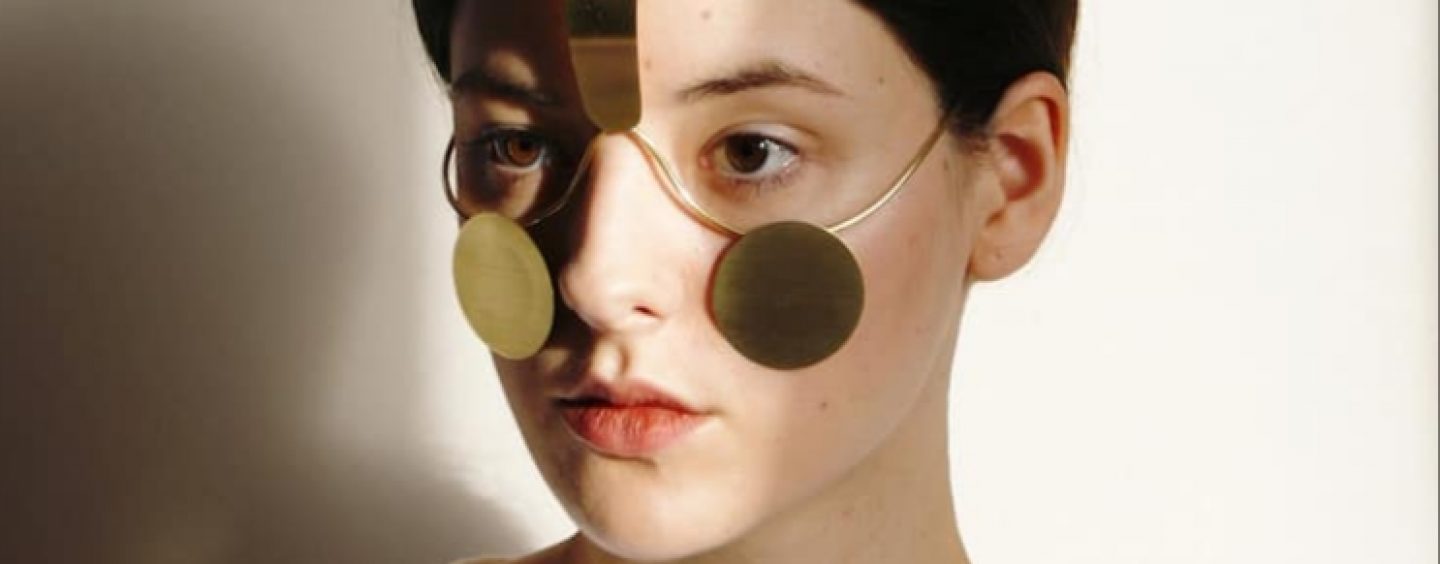 Um polígono alongado repousa entre as sobrancelhas e mede a altura da testa, enquanto dois círculos cobrem as maçãs do rosto. Cada forma é conectada por um fio que também prende a máscara – ela se encaixa nos ouvidos como um par de óculos.