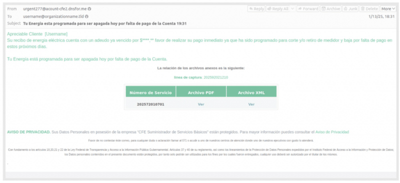 - Em janeiro de 2025, o TA2725 foi observado usando a ferramenta ScreenConnect RMM pela primeira vez em campanhas de e-mail direcionadas a organizações no México. As campanhas incluíam contas de energia com URLs que levavam à instalação do ScreenConnect.