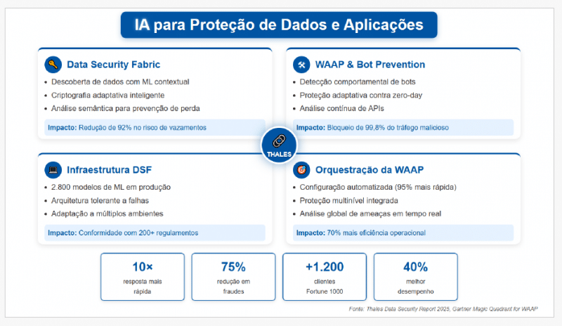Já os sistemas WAAP (Web Application & API Protection), aliados a mecanismos avançados de bot prevention, são capazes de bloquear 99,8% do tráfego malicioso, com proteção contra ataques zero-day e monitoramento contínuo de APIs. A infraestrutura de IA da Thales conta com 2.800 modelos de machine learning em produção, arquitetura tolerante a falhas e capacidade de adaptação a múltiplos ambientes — garantindo conformidade com mais de 200 regulamentações globais. A orquestração automatizada dos sistemas WAAP proporciona 95% mais agilidade na configuração, integração multilayer de proteção e análise global de ameaças em tempo real, resultando em até 70% mais eficiência operacional.