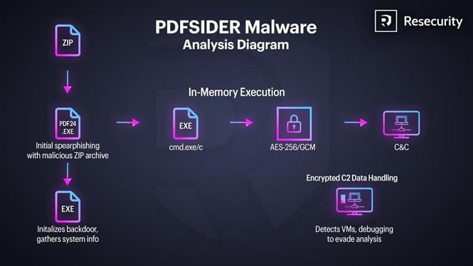 O PDFSIDER é uma variante de malware recém-identificada, distribuída através de DLL side-loading, projetada para implantar secretamente um backdoor com recursos de comando e controle (C2) criptografados. O malware utiliza uma cryptbase.dll falsa para burlar os mecanismos de detecção de endpoint.