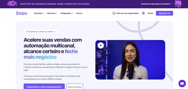 O Snov.io é referência global em email outreach. Ele combina prospecção, automação e análise em uma única plataforma. Seus principais diferenciais incluem: