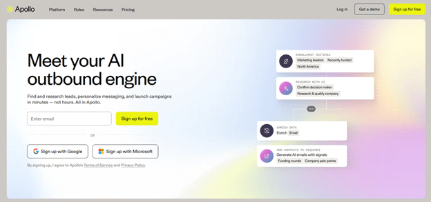 O Apollo.io vai além do email outreach. Ele combina prospecção, cadências multicanal e banco de dados próprio. Entre os recursos: