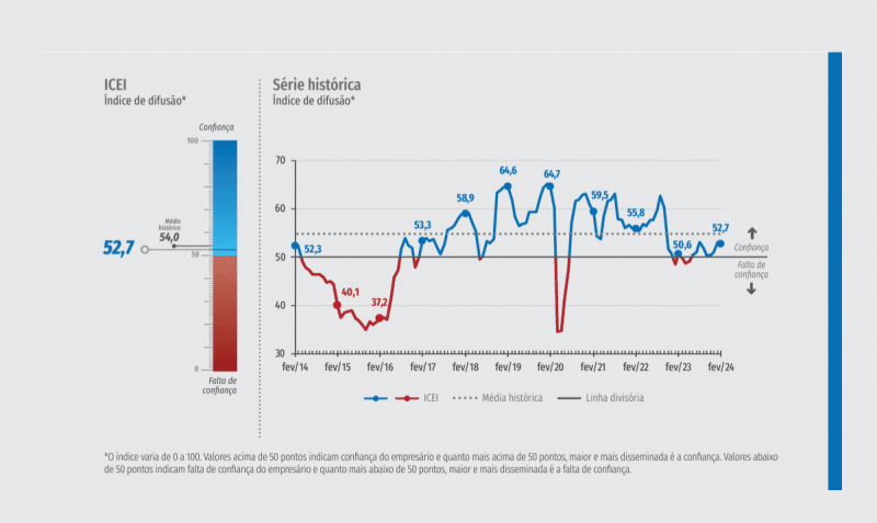 Em fevereiro de 2024, o Índice de Confiança do Empresário Industrial (ICEI) caiu 0,5 ponto, de 53,2 pontos para 52,7 pontos. Embora pequena, a queda interrompe uma sequência de dois meses de avanço da confiança. Apesar da queda, a indústria segue confiante.