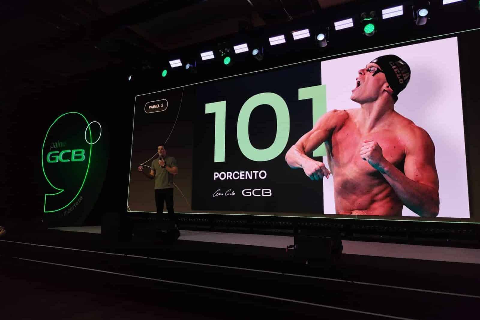 Na sequência, o atleta olímpico Cesar Cielo foi convidado para um momento inspirador em destaque no palco. Cielo, ícone de superação, compartilhou sua filosofia de alta performance e liderança, apresentando o conceito “101%” . A mensagem transmitida foi a de que o esforço extra, a dedicação que excede o esperado, é o fator decisivo para superar limites e alcançar resultados extraordinários tanto nas piscinas quanto nos investimentos.