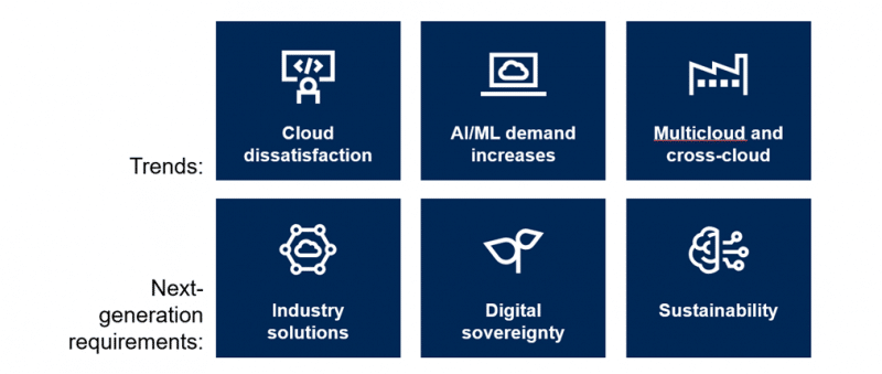 Elas incluem insatisfação com a Nuvem, Inteligência Artificial (IA) / Machine Learning (aprendizado de máquina), multicloud, sustentabilidade, soberania digital e soluções específicas para setores.