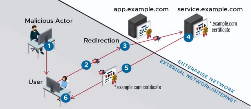 3 – Usando uma das muitas técnicas de manipulação de rede, a solicitação do usuário é redirecionada pelo ator malicioso para service.example.com.