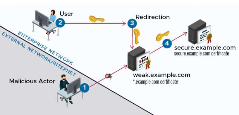 – outro serviço / aplicativo (normalmente não um servidor da web) que apresenta um certificado TLS válido com um nome de assunto que seria válido para o aplicativo da web de destino, como quando os certificados curinga têm escopo muito amplo