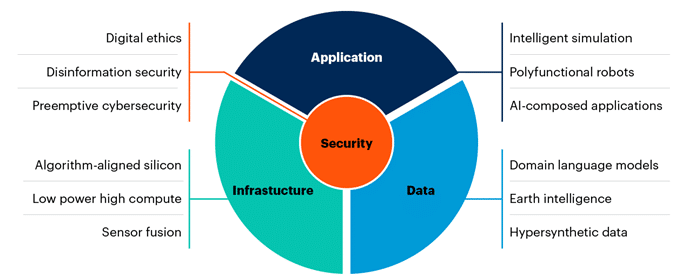 Cada disruptor tecnológico em estágio inicial é significativo por si só, mas, em conjunto, eles começam a definir soluções emergentes mais amplas para novas práticas de negócios. Por exemplo, o avanço das tecnologias de GenAI irá gerar novas soluções em torno de Earth Intelligence e da simulação de negócios, estimulará o crescimento expansivo de modelos de linguagem específicos do domínio e levará a ferramentas de funcionamento mais elevado.